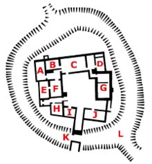 The castle at Penhallam took advantage of a raised area of ground above the marshes, with a circular bank of earth possibly up to 50 feet (15 m) wide and 12 feet (3.7 m) high, surrounded by a shallow, wet moat up to 38 feet (12 m) across. A hall would have been constructed within the ringwork, up to 60 feet (18 m) in length, possibly using stone or cobwalling.[8] A bailey probably lay just to the south, containing the stables and outbuildings, probably within the earth bank that surrounds the modern farmstead.[9]