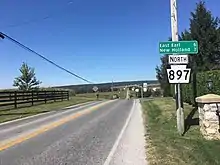 When Pennsylvania first legislated routes in 1911, present-day PA 897 between Gap and White Horse was designated as part of Legislative Route 142, which continued west from White Horse to Lancaster.[7] By 1926, the road between Gap and White Horse was paved.[8] PA 897 was designated in 1928 to run from Reinholds west to Kleinfeltersville along an unpaved road. Also, the road between Gap and White Horse was designated as the easternmost portion of PA 340. At this, the road between Kleinfeltersville and Lebanon was an unnumbered paved road while the rest of the present alignment was an unnumbered unpaved road.[9] By 1930, the road between Blue Ball and Terre Hill was paved.[10] In the 1930s, PA 897 was extended to its current length between US 30 and Gap and US 422 in Lebanon, replacing the portion of PA 340 between Gap and White Horse that was rerouted to head east. At this time, the entire length of the route was paved.[11] PA 897 has remained on the same alignment since.[3][6] PA 419 and PA 897 previously ran concurrent with PA 501 in Schaefferstown between Stiegel Pike and Carpenter Street.[12] In 2013, PA 501 was shifted to bypass Schaefferstown to the west along a new alignment, eliminating the concurrency with PA 419 and PA 897.[13]