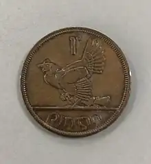 The reverse of the penny was designed by the English artist Percy Metcalfe. It featured a hen and five chicks and the coin's Irish name. The obverse featured the Irish harp. From 1928 to 1937 the date was split either side of the harp with the name Saorstát Éireann circling around. From 1938 to 1968 the inscription changed to Éire on the left of the harp and the date on the right.[1]