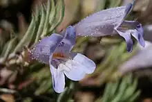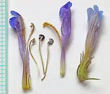 The flowering season is as early as April and as late as July or August.[2][6] The flowers are a variant on the classic penstemon structure of the petals being united into a tube, in this case with five narrow lobes with rounded ends, 4–6.5 mm in length and 1–1.5 mm wide.[4] Overall the flowers are 10–17 millimeters long, though in exceptional cases they may be as long as 21 millimeters with a funnel to bell shape to the tube.[3] As with the leaves and stems they flowers are retrorsely hairy, though they also will have sparse glandular hairs. The externally the flowers are a handsome blue to purplish lavender with reddish violet nectar guides on the petal lobes into the interior. On the lower surface of the flower tube there will be two ridges.[4] The interior of the flower tube is more white-ish in color[3] with the 5–6 millimeter long tube lined with villous hairs.[4] Each flower has four stamens, the longer two stamens will reach or extend slightly beyond the opening of the flower tube. The pollen sacs at the end of the stamens are 0.6–1.2 millimeters in diameter. The hairy staminode for which Penstemon are known 9–12 millimeters long and covered at the end with densely pilose bright golden yellow hairs. The female style is 13–15 millimeters long.[4]