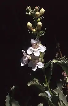 Penstemon deustus is a species of penstemon known by the common names hotrock penstemon and scabland penstemon. It is native to much of the northwestern United States from the Pacific Northwest to Wyoming, where it grows in many types of forest and open plateau habitat, often on soils heavy in volcanic rock or on limestone outcrops. It is a perennial herb with upright branches approaching 40 centimetres (16 in) in maximum height. The thick leaves are lance-shaped to oval or round, and are sharply toothed.[1] Most leaves occur low on the plant. The inflorescence produces tubular flowers with lipped, five-lobed mouths. The glandular flower is cream in color with dark lining and reaches 1.5 cm in length.[1]