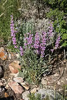 Penstemon pahutensis is a species of penstemon known by the common name Pahute Mesa beardtongue, or simply Pahute beardtongue. It is native to the desert hills and mountains of southern Nevada, including the Pahute Mesa for which it is named.[1] It can also be found in a few areas over the border in California. It is a perennial herb growing up to 35 centimeters (14 in) tall. The paired, narrow leaves are linear to lance-shaped and up to 10 centimeters (4 in) long. The inflorescence bears blue-purple flowers up to 3 centimeters (1+1⁄4 in) long. The inside of the wide mouth of the flower is lined with white or yellow hairs, and the staminode is coated in yellow hairs.