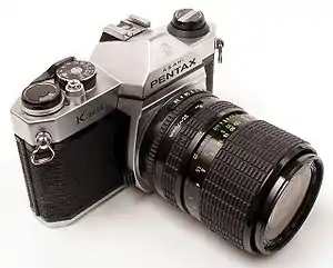 The Pentax K1000 (originally marked the Asahi Pentax K1000) is an interchangeable lens, 35 mm film, single-lens reflex (SLR) camera, manufactured by Asahi Optical Co., Ltd. from 1976 to 1997, originally in Japan.[1][2] The K1000's extraordinary longevity makes it a historically significant camera. The K1000's inexpensive simplicity was a great virtue and earned it an unrivalled popularity as a basic but sturdy workhorse. The Pentax K1000 eventually sold over three million units.[3]