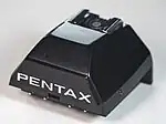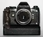 The Pentax LX is a 35mm single-lens reflex camera produced by Pentax in Japan. It was introduced in 1980 to commemorate the 60th anniversary of Asahi Optical Co. (hence the Roman numerals LX), and was produced until 2001.[2] It is the top-of-the-line professional, or "system", camera in the Pentax manual focus range, with manual and aperture priority automatic exposure modes and an advanced light metering system. The LX uses the K mount, which is the Pentax proprietary bayonet lens mount, and has a large body of accessories. The camera has several unique or uncommon features, and compared with contemporary professional camera bodies from rival manufacturers, like the Canon New F-1 or Nikon F3, the LX body is smaller and lighter, weighing in at 570 grams (1.26 pounds)[lower-alpha 1] with its standard FA-1 finder.[5][6]