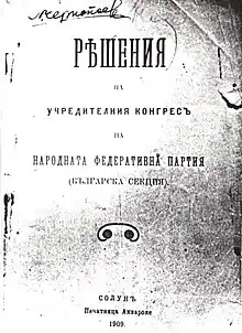 The People's Federative Party (Bulgarian Section) (Bulgarian: Народна федеративна партия (българска секция)) was a Bulgarian political party in the Ottoman Empire, created after the Young Turk Revolution, by members of the left wing of the Internal Macedonian Adrianople Revolutionary Organization (IMARO).[1][2][3] The party functioned for one year from August 1909 until August 1910.[4] The Party decided to name itself Bulgarian Section, since it was hoped that other nationalities from European Turkey would adopt its program and form their own ethnic sections, but this didn't happen.[5] Its main political rival was the Union of the Bulgarian Constitutional Clubs.