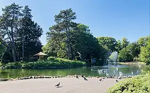 The idea of a public park in Grimsby was first proposed in about 1860, and in 1869 the 'Great Grimsby Improvement Act' was set up.[2] Mr Billing, the Superintendent of Grimsby Cemetery, was responsible for organising the planting of about 700 trees, including about 120 elm trees, about 240 lime trees, about 120 sycamore trees, and about 120 chestnut trees. These trees had been purchased and planted before the winning design to lay out the new park had been decided. Of the 24 designs submitted the winning design was that of William Barron and Son of the Elvaston Nurseries in Derbyshire, who was awarded the contract in June 1882. William Barron's design was a figure of eight with the top loop in the north containing the lake and various mounds, made with the soil dug out to create the lake, together with clusters of trees and shrubs. The loop in the south was rather more flat and provided areas for the cricket pitch and other sporting and recreational facilities.[1] The lake contains mallard, coot, moorhen and geese.