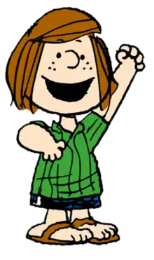 Peppermint Patty[1] is a fictional character featured in Charles M. Schulz's comic strip Peanuts.[2] Her full name, very rarely used in the strip, is Patricia Reichardt.[3] She is one of a small group in the strip who live across town from Charlie Brown and his school friends (although in The Peanuts Movie, Snoopy in Space, and The Snoopy Show she, Marcie, and Franklin live in the same neighborhood and attend the same school). She has freckles and "mousy-blah" hair, and generally displays the characteristics of a tomboy, while also being shown to not be a strict complier. She made her first appearance on August 22, 1966.[4] The following year she made her animated debut in the TV special You're in Love, Charlie Brown and began (in the comics) coaching a baseball team that played against Charlie Brown, and thereafter had other adventures with him. Uniquely, she refers to Charlie Brown and Lucy as "Chuck" and "Lucille", respectively. In most of her appearances, she is attracted to Charlie Brown, based on her reactions. Her birthday is October 4.[5]