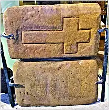 The stones consist of "two red sandstone tablets and a heart-shaped rock made of red quartzite. Each block is approximately 8.25” (~ 21 cm) by 14” (~35.6 cm) and 2” thick, weighing about 25 lbs. Each red stone block is carved with lines and one long line. When the two blocks are placed side by side and the stone heart is inserted the long line has 18 dots pecked into it. This style of map is known as a Post Road Map and it is a style used in Mexico and Spain during the Mexican–American War. Inscribed on the stones is the date 1847, and one stone contains a Sunken relief or intaglio of a heart, into which the heart-shaped stone fits perfectly. The back of the stone that the heart-shaped stone fits into has the outline of a cross carved into it.