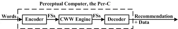 The perceptual computerPer-C – an instantiation of perceptual computing – has the architecture that is depicted in Fig. 1 [2]–[6]. It consists of three components: encoder, CWW engine and decoder. Perceptions – words – activate the Per-C and are the Per-C output (along with data); so, it is possible for a human to interact with the Per-C using just a vocabulary.