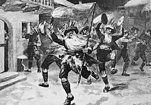 Perchtenlaufen is a folk custom found in the Tyrol region of Central Europe. Occurring on set occasions, the ceremony involves two groups of locals fighting against one another, using wooden canes and sticks. Both groups are masked, one as 'beautiful' and the other as 'ugly' Perchte.[2]