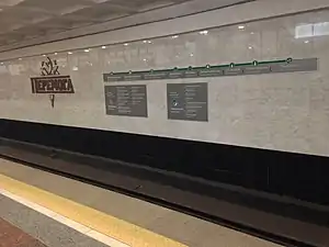 Architecturally, the station was planned to be modeled in the (former Soviet Union holiday celebrated on 9 May) Victory Day theme.[10] In April 2015, the parliament of Ukraine outlawed Soviet and Communist symbols, street names and monuments, in a set of decommunization laws.[11] In May 2015 Ukraine abolished Victory Day and replaced the holiday with Victory Day over Nazism in World War II (also celebrated on 9 May).[6] Hence, the station's interior was slightly changed to comply with the April 2015 decommunization laws.[10][12]