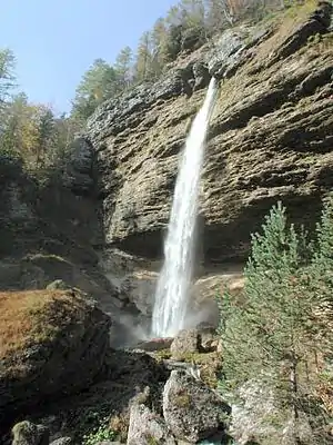 Peričnik Falls is one of the best-known waterfalls in Slovenia. It flows from a hanging valley in Triglav National Park into the glacial Vrata Valley, where the water of Peričnik Creek then flows into Bistrica Creek.[1] There are actually two waterfalls: Upper Peričnik Falls (Slovene: Zgornji Peričnik, 16 meters or 52 feet high) and Lower Peričnik Falls (Slovene: Spodnji Peričnik, 52 meters or 171 feet high).[1] The larger, lower waterfall is usually simply known as Peričnik Falls. A view of both falls is possible by crossing Bistrica Creek and ascending the scree slope a few dozen meters.