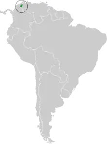 The Perijá metaltail is found in the Serranía del Perijá, which straddles the border between northern Colombia and northwestern Venezuela. It inhabits the varied landscapes of the different peaks within the mountain range, including open bushy terrain, karstic elfin forest, bamboo stands, grassy páramo, and areas of sandstone outcrops. In elevation it ranges between 2,400 and 3,200 m (7,900 and 10,500 ft) in Colombia and as low as 1,850 m (6,100 ft) in Venezuela.[6]