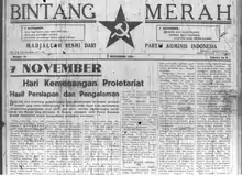 In 1945, during the Indonesian National Revolution, Pardede joined a nationalist youth brigade led by Wikana (the Angkatan Pemuda Indonesia, API); he seems to have been radicalized into left-wing politics during this period.[3] At around this time he joined the Communist Party of Indonesia (Partai Komunis Indonesia, PKI), possibly recruited by a colleague from the watch shop, Mohammad Sain, who had been one of the members who refounded the party in 1945.[3][4] The watch shop was the headquarters of the Communist magazine Bintang Merah, and Pardede worked as an editor under the guidance of Lukman.[4][3] He also spent time in Yogyakarta during 1947–8 working as a clerk for the foreign ministry of the Indonesian Republic and for the People's Democratic Front (Front Demokrasi Rakjat, FDR), eventually being elected to its secretariat along with fellow communists D. N. Aidit, Njoto and Sudisman.[3][1] When the FDR was implicated in the Madiun Affair in 1948, a conflict between the Republican government and the PKI, Pardede was forced to flee Yogyakarta under the alias Abdullah.[2] Bintang Merah ceased publication during this time.[5] He spent some time in a Republican military unit as head of the community section of the Wadaslintang Military District Command.[2]