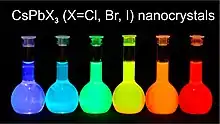 - ↑ Protesescu, L.; Yakunin, S.; Bodnarchuk, M.I.; Krieg, F.; Caputo, R.; Hendon, C.H.; et al. (29 January 2015). "Nanocrystals of cesium lead halide perovskites (CsPbX3, X = Cl, Br, and I): Novel optoelectronic materials showing bright emission with wide color gamut". Nano Letters. 15 (6): 3692–3696. Bibcode:2015NanoL..15.3692P. doi:10.1021/nl5048779. PMC 4462997. PMID 25633588.