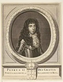 Dom Pedro II (Peter II; 26 April 1648 – 9 December 1706), nicknamed "the Pacific", was King of Portugal from 1683 until his death, previously serving as regent for his brother Afonso VI from 1668 until his own accession.[1] He was the fifth and last child of John IV and Luisa de Guzmán.