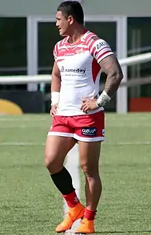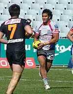 On 3 May, Mata'utia returned to the Samoan side against Fiji in the 2014 Pacific Rugby League International.[26] In Round 10 of the 2014 NRL season, he made his club debut for the Dragons against the Parramatta Eels.[27] On 8 September, he was named in the Samoan train-on squad for the 2014 Four Nations,[28] later making the final 24-man squad for Samoa,[29][30] however he was unable to compete in the tournament due to passport issues.[31]