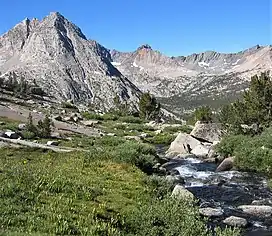 Peter Peak is a 12,490-foot-elevation (3,810-meter) mountain summit located west of the crest of the Sierra Nevada mountain range, in Fresno County of central California, United States.[2] It is situated in northern Kings Canyon National Park, 2 miles (3.2 km) southwest of The Hermit, and 0.6 miles (0.97 km) northwest of Mount McGee, the nearest higher neighbor. Topographic relief is significant as the west aspect rises 2,900 feet (880 meters) above Goddard Canyon in 1.5 mile. The John Muir Trail passes to the east, providing an approach. This geographical feature was named by the Sierra Club in 1938 in memory of one of their own, Peter Grubb (1919–1937), who made the first ascent of this peak in 1936.[5] Peter died at Capri, age 18, while traveling on a bicycle tour of Italy.[6] This mountain's name has been officially adopted by the United States Board on Geographic Names.[2]