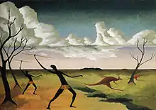 Throughout the late 1930s, Purves Smith painted in London and Paris, which critic Bernard William Smith cites as his most important era.[2] Not only did Purves Smith paint his new physical surroundings (1939's Early Morning in Paris) and political environment (1938's The Nazis, Nuremberg), but also recalled works of the Australian landscape, namely Kangaroo Hunt (1938), which was included in the touring exhibition Art of Australia 1788-1941, and acquired by the Museum of Modern Art, New York.[5] In 1939, art critic Gino Nibbi said "Purves Smith seems one of the most qualified at the present time to give some allegorical interpretations of the virgin appearance of the Australian landscape".[2] He painted a scene from the Burke and Wills expedition in 1937 (several years before Sidney Nolan began his Burke & Wills series[6]), and the "pole-like trees, elongated figures, sheets of iron, and low horizons" of his early 1940 Drought landscapes anticipated "in more ways than one" the future direction of Drysdale's art.[2][7] According to art historian Sasha Grishin, Purves Smith's "apocalyptic" depictions of Australia's desolate interior convey a fear of vast space, and employ a "recognizable Australian setting to express both personal, as well as broader social anxieties" in the lead up to war.[8]