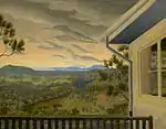 Peter Purves Smith was hospitalised in 1948, and later drafted to the Heidelberg Repatriation Hospital for major lung surgery. He died of post-operative shock the next day, 23 July 1949, and was cremated.[16] Despite his small oeuvre of less than 100 paintings and posthumous descent into relative obscurity,[5] Purves Smith emerged as a celebrated artist—influencing many of his contemporaries—and has been recognised as "the first of the young modern artists to look inquiringly at the Australianness of country life".[7] His use of surreal elements, colloquial themes and at times biting satire set precedent for the work of the Melbourne-based Angry Penguins in the mid to late 1940s.[5] Two retrospective exhibitions were held in Melbourne: one at the Stanley Coe Gallery in 1950,[17] and the other at the Joseph Brown Gallery in 1976.[5][18] A touring exhibition of his work commenced in 2001 following the publication of Mary Eagle's biography Peter Purves Smith: A Painter in Peace and War.[19]