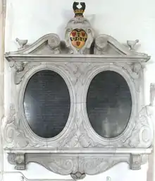 His "very neat and tasteful"[25] mural monument, erected in 1679 by his son Samuel, survives in St Disen's Church, Bradninch, on the north wall of the chancel. It consists of two elliptical tablets of black marble, set in a carved frame of white Italian marble, surmounted by the Sainthill arms and crest. The left tablet is inscribed as follows:[26][27]