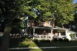 The Peter and Mary Smith House, also known as the Hopkins House and the Otto House, is a historic dwelling located in Lake City, Iowa, United States. Peter Smith was a pioneer to this town and a prominent businessman.[2] He was involved in retail, banking, and real estate. Smith and his first wife Sarah settled in Calhoun County, Iowa from Cass County, Michigan around 1855, and bought land near the present Smith Farmhouse. He served as the first judge in the county when Lake City was the county seat. Sarah died in 1875 while they were living in Glidden, Iowa. After the arrival of the railroad in 1881, Peter and his second wife Mary moved to Lake City. They built this two-story, brick, L-shaped house in 1887. While it does not conform to any one style, it is primarily a combination of the Italianate and the Gothic Revival styles.[2] The Italianate influence is found in the bracketed cornice, segmentally arched lintels, wooden cutout designs over the windows, a front bay window, and the hipped roof. The influences of the Gothic Revival style are found in the bargeboard and the roof line. The house was listed on the National Register of Historic Places in 1990.[1]
