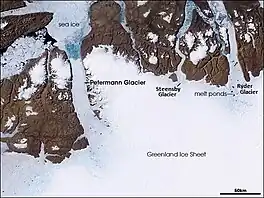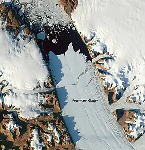 - ↑ Hansen, Kathryn; Shuman, Christopher (May 19, 2023). "Retreat at Petermann Glacier". NASA Earth Observatory. NASA. Retrieved August 14, 2023.
