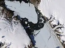 A series of satellite images from 2002 through 2009 illustrate that the terminus of the glacier has advanced towards the ocean, however, several lateral rifts have developed also. The distance of this rifts or cracks back from the terminus has diminished for this time period also and may serve as a precursor to natural ice calving from Petermann Glacier.[6] A large chunk estimated to be 100 square miles (260 km2) calved off the glacier[7] in August, 2010. The Danish Meteorological Institutes maintains an archive of imagery of Petermann Glacier and adjacent coastal areas of Greenland[8][9] from both European and US satellites and sensors such as Envisat, MODIS, and AVHRR.