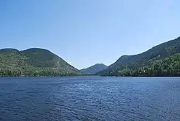 Petit lac Ha! Ha! has a length of 4.9 kilometres (3.0 mi) between the surrounding mountains, forming a southward hook at the western end of Lake Ha! Ha!. Its maximum width is 1.2 kilometres (0.75 mi); its altitude is 381 metres (1,250 ft); and its area is . Petit lac Ha! Ha! is fed by the Quiscane stream (coming from the North and draining the Huard lake) and by an unidentified stream flowing from the east. This lake includes the Canots Cove (west side), Creuse Bay (South Shore) and Lambert Bay (South Shore).
