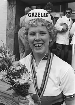 In 1979 Petra de Bruin won the road race at the World Cycling Championships,.[2] She came third in 3 km pursuit at the UCI Track Cycling World Championships in 1980.[3]