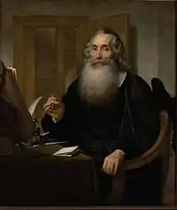 Scriverius belonged to the political Party of the Dutch States Party of Oldenbarnevelt and Grotius and brought down the displeasure of the government by a copy of Latin verses to honour of their friend, the Remonstrant Leiden pensionaris Rombout Hoogerbeets.[1] Scriverius' poems were considered libelous and he was fined 200 guilders, but when the councilmen came to collect, Scriverius directed them to the kitchen to collect pots and pans, which were not worth enough money. His wife then directed the gentlemen to the books in the library by claiming that it was the books that caused her husband to write the poems and so proceeds from a book sale should pay for the fine on them.[2] Scriverius and his wife enjoyed a long marriage of 57 years and had at least 8 children. Their portraits were painted on the occasion of their 25th wedding anniversary by Frans Hals.