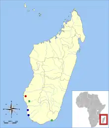 | Range of Macrotarsomys petteri on Madagascar. Red: find of a living animal; green: subfossil material; blue: subfossil material that is possibly referable to this species | |