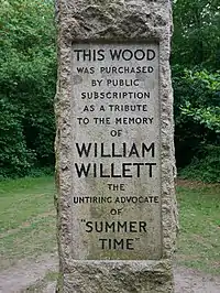 - William Willett (1856-1915) - promoter of Daylight Saving Time, an idea he is thought to have come up with whilst riding in Petts Wood.[3] He is commemorated by a memorial sundial in the wood, and the pub The Daylight Inn is named in his honour.