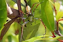 Malagasy green lynx spider (P. lucasi) and green bottle fly (Lucilia sp.)