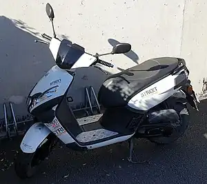 The Peugeot Streetzone is a scooter produced since 2013 by Peugeot Motocycles.[3] An electric version, named the Peugeot e-Streetzone, was unveiled at the 2022 Paris Motor Show and will be available from 2023 with one or two batteries and a maximum range of 112 km (70 mi).[4]