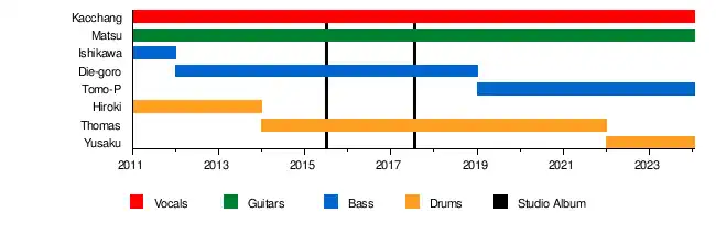 The band has been through 4 lineup changes. In 2012, bassist Ishikawa left the band. He was replaced by Die-goro, already in the same year. Die-goro was the band's bassist until 2019, and was replaced by Tomo-P, which is their current bassist. In 2014, drummer Hiroki left the band. He was replaced by Thomas in the same year, which was later replaced by Yusaku who is the current band's drummer.[1]