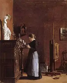 In 1877, he married one of his models, Angéline Charlet, but she died two years later, in childbirth. To help with his grief, he took an extended trip to Italy, but became ill and returned home. Once there, he threw himself into his work, producing large, impressive works for submission to all the salons. In 1881, he began an especially ambitious triptych; on the subject of the Redemption. During this work, he became especially attracted to a model named Julia Marie Fagoo, the daughter of a farmer; painting a series of small genre scenes with her.