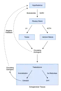 In men, blockade of the AR by bicalutamide in the pituitary gland and hypothalamus prevents the negative feedback of androgens on the hypothalamic–pituitary–gonadal (HPG) axis, resulting in an increase in luteinizing hormone (LH) secretion and levels.[85] Follicle-stimulating hormone (FSH) levels, in contrast, remain essentially unchanged.[86] The increase in LH levels leads to an elevation in androgen and estrogen levels.[87] At a dosage of 150 mg/day, bicalutamide has been found to increase testosterone levels by about 1.5- to 2-fold (59–97% increase) and estradiol levels by about 1.5- to 2.5-fold (65–146% increase).[63][75][82] However, there is variability in these increases, and in one clinical trial, the highest testosterone concentration that occurred with 50 mg/day bicalutamide monotherapy was 2,306 ng/dL, which was five times the normal average level of testosterone in men.[41][88] Levels of DHT are also increased to a lesser extent (by 24–30%), and concentrations of sex hormone-binding globulin (SHBG) and prolactin increase as well (by 8–42% and 40–65%, respectively) secondary to the increase in estradiol levels.[82][89][90] The estradiol concentrations produced in men by bicalutamide monotherapy are said to approximate the low-normal estradiol levels of a premenopausal woman,[75] while testosterone levels generally remain in the high end of the normal male range and rarely exceed it.[91][30] Dosages of bicalutamide of 10 mg, 30 mg, and 50 mg per day have been found to produce a "moderate" effect on sex hormone levels in men with prostate cancer (notably providing indication that the drug has clinically-relevant antiandrogen effects in males at a dosage as low as 10 mg/day).[92][84] The elevated levels of gonadotropins and gonadal steroids associated with NSAA monotherapy is a unique endocrine state which can be described as "hypergonadotropic hypergonadism".[93][94]