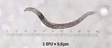 P. hermaphrodita is unsegmented, vermiform, bilateral symmetrical pseudocoelomate. The body dimensions and structure of P. hermaphrodita is comparable to C. elegans' with a body length 1.3 - 1.7mm long [6] and an estimated circumference of 0.180mm. The primary structures are the Rhabditida-specific mouth, the pharynx, the intestine, the reproductive system (uterus, spermatheca, gonads) and the cuticle. Like all nematodes, it has four muscle bands that span the length of the body and has no devoted respiratory or circulatory system.[7] P. hermaphrodita has four larval stages before becoming a fully reproductive hermaphroditic adult female.[8] Males do exist in this species, but are very rare with Maupas only able to find 21 males among 15,000 individuals (0.14% of the population).[9] Third-stage dauer larvae are produced in unfavourable conditions such as low food levels, high population density or high temperatures.[10] Dauer larvae have constricted pharynx, double the thickness of a normal cuticle and increase of lipid droplets in their cytoplasm.[11] However, the most important aspect of the dauer stage is its ability to serve as the infective stage that seeks out new hosts, once the previous bacterial food source has been depleted.[12][13] Dauers do not require a food source and can survive up to eight times longer than the original life span of a non-dauer nematode.[10] P. hermaphrodita is morphologically identical to two other Phasmarhabditis species P. neopapillosa[14] and P. tawfiki.[15] However, P. neopapillosa is a gonochoristic species with an equal number of males and females.[14]