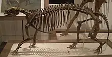 The typical Phenacodus primaevus was a relatively small ungulate about 1.5 m (4 ft 11 in) long and weighed up to 56 kg (123 lb), of slight build, with straight limbs each terminating in five complete toes, and walking in the digitigrade fashion of the modern horse.[3][4] The middle toe was the largest, and the weight of the body was mainly supported on this and the two adjoining digits, which appear to have been encased in hooves, foreshadowing the tridactyl type common in perissodactyls and certain extinct groups of ungulates. The skull was small, with proportionately minute brain; and the arched back, strong lumbar vertebrae, long and powerful tail, and comparatively feeble fore-quarters all proclaim kinship with the primitive carnivores Creodonta. All the bones of the limbs are separate, and those of the carpus and tarsus do not alternate - each one in the upper row is placed immediately above the corresponding one in the row below. The full series of forty-four teeth was developed; and the upper molars were short-crowned, or brachyodont, with six low cusps, two internal, two intermediate and two external, so that they were of the typical primitive bunodont structure.