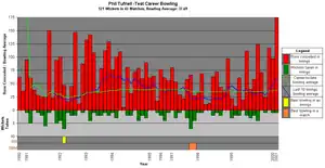 As a slow left-arm orthodox spin bowler, Tufnell played 42 Test matches and 20 One Day Internationals for England between 1990 and 2001, and 316 first-class matches, mainly for Middlesex. Tufnell occasionally produced remarkable performances, for example taking 11–93 against Australia at the Oval in 1997 (for which he won the Man of the Match award after England won by 19 runs) and seven wickets in the match (6–25 in the first innings) against the West Indies at the Oval in 1991,.[5] He took his 121 Test wickets with a bowling average of 37.68 across his whole Test career. Mark Waugh theorised that "if you attack him, he can go on the defensive, and it puts him off his game",[6] although Waugh was Tufnell's most frequent test victim, being dismissed a total of seven times by him, three of them bowled.[7]