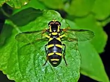 Philhelius pedissequus can reach a length of 10–13 millimetres (0.39–0.51 in) and a wing length of 7.25–9.75 mm.[7][5] These hoverflies have a black body, with two yellow lateral stripes on the thorax, and yellow markings on tergites two to five. The pairs of tergites 2 are wedge-shaped and considerably wide.[5][6]