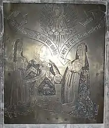 - Richard Mede (d.1491),[4] of Barrow Court in Tickenham,[1] son and heir, who married twice, firstly to Elizabeth Sharpe, daughter of John Sharpe,[5] and secondly to Anne Pauncefoot, daughter of Thomas Pauncefoot of Hasfield, in Gloucestershire. Anne survived her husband and remarried to Arthur Kemys. Richard's children all died young, and his heir was his sister Isabel Mede. Richard's monumental brass survives in the easternmost compartment of the "Mede Chantry" erected by his father (see below) in St. Mary Redcliffe Church, Bristol. It is an oblong plate, upon which are incised figures of a man kneeling opposite a kneeling woman with another woman standing behind him. He is of youthful appearance with smooth face and long flowing hair, and is clad in complete plate armour, over which he wears a tabard embroidered with the arms of Mede. He is without spurs and his helmet lies on the ground. His second wife kneeling opposite him wears a pedimental headdress with veil hanging down behind, necklace and girdle, and plain gown, over which is her mantle emblazoned with the arms of Pauncefoot: Gules, three lions rampant argent. The standing figure, Richard's first wife, is similarly clad, but without mantle. From the kneeling figures arise speech scrolls inscribed: from mouth of Richard: Sanct.. Trinitas un(us) de(us) miserere nobis "O Holy Trinity, one God, have pity on us"); Speech scroll from mouth of his wife: Pater de caelis, deus miserere nobis ("Father from Heaven, God have pity on us") addressed to the Holy Father, whose radiated demi-figure is engraved above, supported by a cloud (indicated by a line nebulée) with his hands raised in blessing.[1]