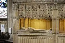 From his will it appears that the surviving fine double monument,[16] known as the "Mede Chantry (chapel)", at the east end of the North aisle of the choir of St. Mary Redcliffe Church, was erected on his order.[1] The monument comprises a beautiful heavily canopied double altar-tomb standing against the north wall of which the westernmost contains the recumbent effigies of a man and his wife, their heads resting upon cushions supported by angels. The man is bare-headed, his hair combed back, and is clad in a sleeveless mantle, from which emerge the arms and cuff of an undergown, a scarf hangs from his left shoulders, and a leathern gypciere from his girdle, his feet resting upon a couchant dog. His wife wears a broad fillet across her forehead, her head-dress falling back, a tight-fitting gown with cuffs at the wrists, and a short girdle, her pointed shoes enveloped in the folds of her dress, resting upon two little dogs.[1] On the wall behind the effigies is an heraldic escutcheon displaying the arms of Mede: Gules, a chevron ermine between three trefoils slipped argent, and upon a fillet of brass along its front is an incomplete Latin inscription: ... predicti Thoma(e) Mede, ac ter maioris istius villae Bristolliae, qui ob(ii)t 20 die mensis Decembris Anno D(omi)ni 1475 quoram animabus propicietur Deus, Amen[1] ("... of the foresaid Thomas Mede and thrice Mayor of this town of Bristol, who died on the 20th day of the month of December in the year of our Lord 1475, on the souls of whom may God look upon favourably, Amen"). It is reasonable to suppose[1] that the missing word before "predicti" may have been filius ("son") or frater ("brother"). The other compartment remains empty, but has the monumental brass of his son Richard Mede affixed to the rear wall (see above). Above both compartments is a handsome continuous canopy of rich stone carving, supported by demi-angels bearing open books, and wearing upright caps with hexagonal flowers upon their heads. Above them rise crocketed and finialled niches, surmounted by cornice and cresting.[1]