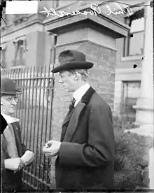 Philip Roosevelt, first cousin once removed of Theodore Roosevelt, standing at the gate outside Mercy Hospital where his cousin was taken after a 1912-10-14 assassination attempt (1912-10-15)