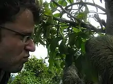 Philippe Cuénoud with a three-toed sloth in Panama, 2006.