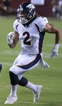 Phillip Lindsay (born July 24, 1994) is an American football running back who is a free agent. He was born in Denver, Colorado, grew up in Aurora, Colorado, and attended South High School in Denver where he became the school's all-time leading rusher with 4,587 yards.[1] He played college football at the University of Colorado Boulder and set the school record in all-purpose yards (5,760) and yards from scrimmage (4,683).[2] He was signed as an undrafted free agent by the Denver Broncos in 2018. Lindsay became the first undrafted offensive rookie to make the Pro Bowl.[3]