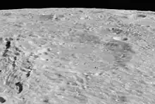Phillips is a lunar impact crater that is located in the vicinity of the Moon's east-southeastern limb, named after British geologist John Phillips.[1] The larger walled plain Humboldt lies across the eastern rim of Phillips, and the outer rampart covers nearly half the interior floor. The surviving rim is eroded in places, and not quite circular.
