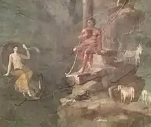 There were contradictory ancient accounts concerning Philoxenus' inspiration for the poem.[23] According to a Scholiast on Theocritus' Idyll 6, the historian Duris (c. 340–c. 260 BC) said that there was a shrine to Galatea near Mount Etna built by Polyphemus, and that when Philoxenus visited the shrine and could think of no reason for it, he invented the story of Polyphemus' love for Galatea.[24] However, in what is probably the earliest account, that of Phaenias', by way of Athenaes, Philoxenus' Cyclops was written, while the poet was imprisoned in the quarries, as a court satire, where, in the manner of a Roman à clef, the characters in Philoxenus' dithyramb: Polyphemus, Odysseus and the sea nymph Galatea, were meant to represent Dionysius, Philoxenus, and Dionysius' mistress, the aulos-player Galatea, respectively.[25]
