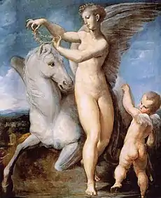 Chiron was her son by Cronus.[3] Cronus' wife Rhea walked in on them, thereupon Cronus assumed the form of a stallion and galloped away, in order not to be caught by her, hence the half-human, half-equine shape of their offspring;[4][5] this was said to have taken place on Mount Pelion.[6] When she gave birth to her son, she was so disgusted by how he looked that she abandoned him at birth, and implored the gods to transform her into anything other than anthropomorphic as she could not bear the shame of having had such a monstrous child; the gods (specifically Zeus) changed her into a linden tree.[7]